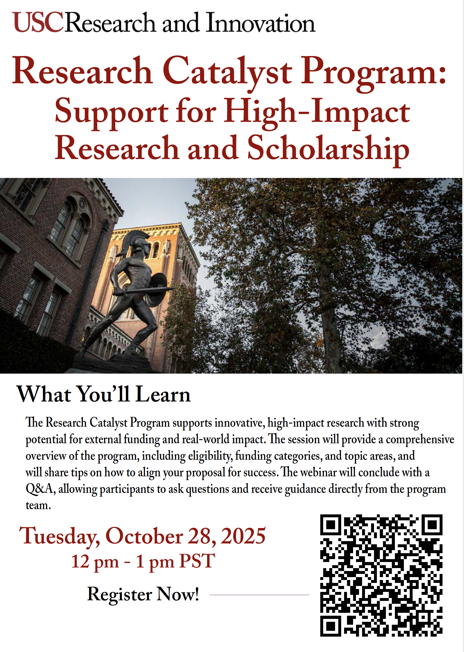 Join the Office of Research and Innovation for an informational webinar on the Research Catalyst Program. This exciting program supports innovative, high-impact research with strong potential for external funding and real-world impact. The session will provide a comprehensive overview of the program, including eligibility, funding categories, and topic areas, and will share tips on how to align your proposal for success.